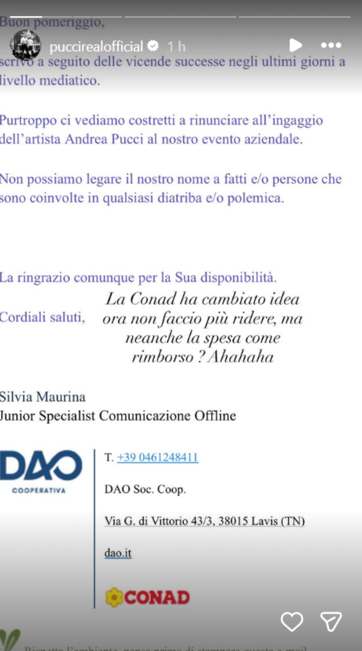 Il dibattito sulla sua partecipazione a Sanremo ha preso il sopravvento nei media, ma parallelamente, un altro fronte si è aperto nella sua vita professionale. Un noto marchio della grande distribuzione, con cui Pucci aveva un accordo per un evento aziendale, ha deciso di ritirarsi dalla collaborazione. La mail di Conad, resa pubblica dal comico, spiegava che a causa delle recenti vicende mediatiche, l'azienda si vedeva costretta a distanziarsi per non associare il suo nome a controversie.